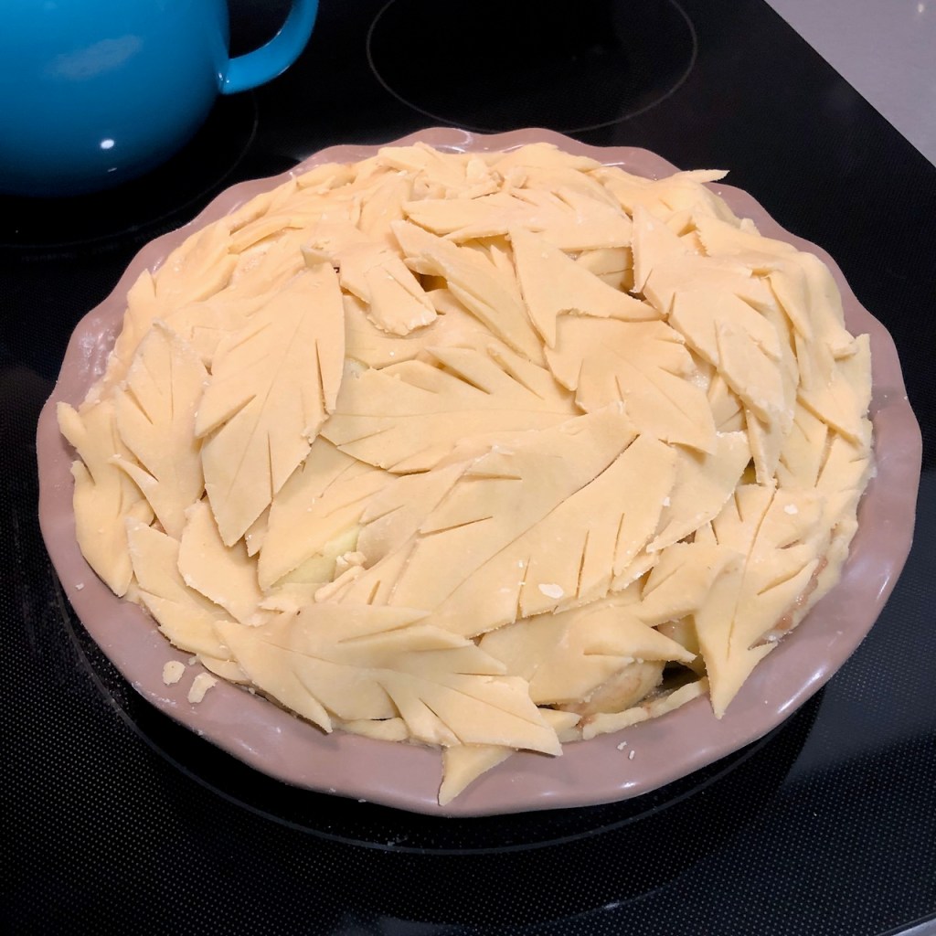 This recipe caught my eye because instead of a regular type crust, she’s taken the time to carve out little ‘leaves’ from the dough, and placing them over the top of the pie to form a really neat looking crust. It’s a real showpiece if you’re serving others at your table.