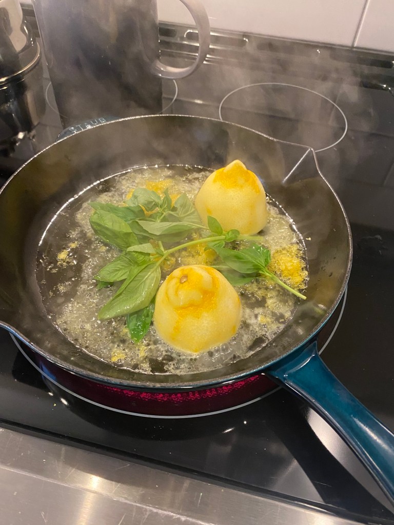 - Add 4 tablespoons of extra virgin olive oil to your pan, along with the zest of one lemon – do this before putting the pan on the hot stove. Break a few pieces of fresh mint leaves (using your hands) into the pan.